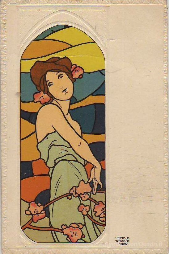 Ti offriamo una riproduzione artigianale su tela dell'opera famosa 'Stained Glass Art' di Raphael Kirchner, dal Museo delle Riproduzioni.