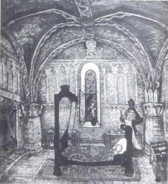 Ti offriamo una riproduzione artigianale su tela dell'opera famosa 'Stanza di Maleine' di Nicholas Roerich, dal Museo delle Riproduzioni.
