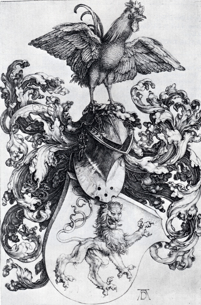Ti offriamo una riproduzione artigianale su tela dell'opera famosa 'Stemma con Leone e gallo' di Albrecht Durer, dal Museo delle Riproduzioni.