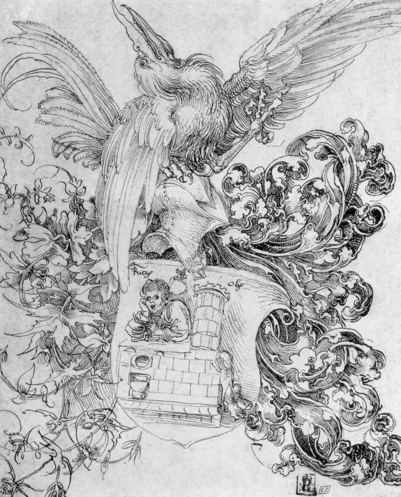 Ti offriamo una riproduzione artigianale su tela dell'opera famosa 'Stemma con l'uomo aperto dietro' di Albrecht Durer, dal Museo delle Riproduzioni.