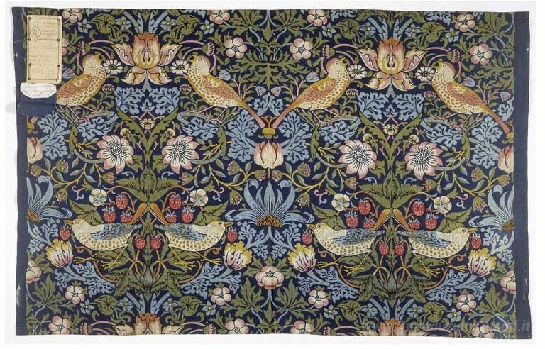 Ti offriamo una riproduzione artigianale su tela dell'opera famosa 'Strawberry Thief, tessuto arredo' di William Morris, dal Museo delle Riproduzioni.