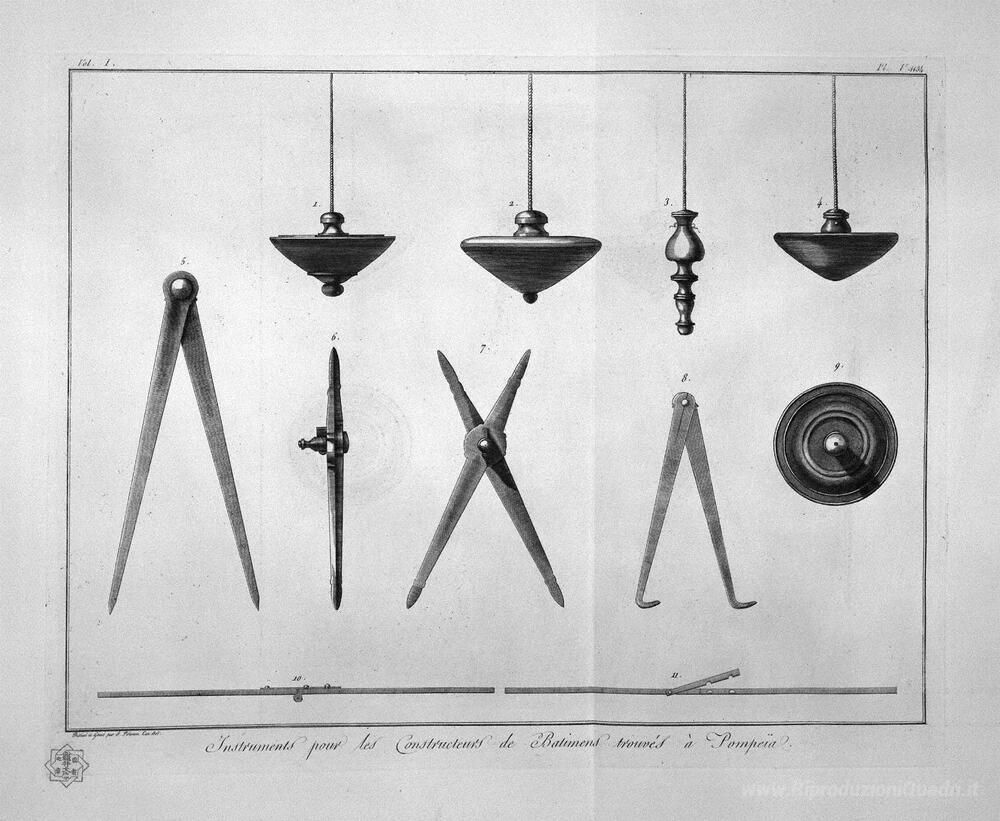 Ti offriamo una riproduzione artigianale su tela dell'opera famosa 'Strumenti di costruttore' di Giovanni Battista Piranesi, dal Museo delle Riproduzioni.