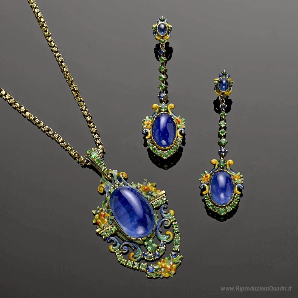 Ti offriamo una riproduzione artigianale su tela dell'opera famosa 'Suite di zaffiro, granato demantoid e smalto' di Louis Comfort Tiffany, dal Museo delle Riproduzioni.