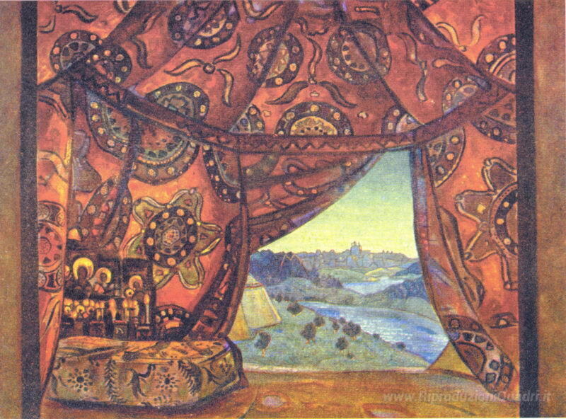Ti offriamo una riproduzione artigianale su tela dell'opera famosa 'Tenda di Ivan il Terribile' di Nicholas Roerich, dal Museo delle Riproduzioni.