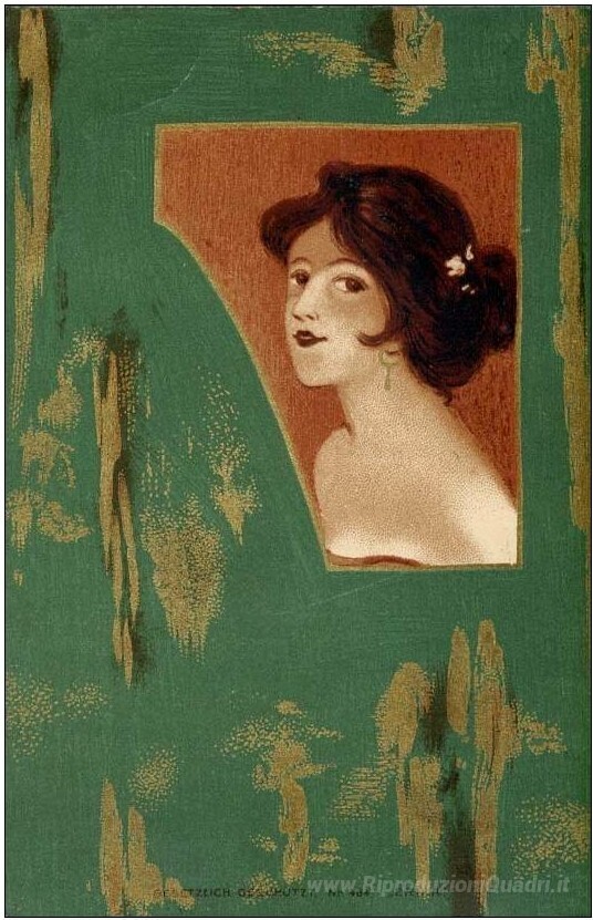 Ti offriamo una riproduzione artigianale su tela dell'opera famosa 'Testa e le spalle delle ragazze su un pannello verde' di Raphael Kirchner, dal Museo delle Riproduzioni.