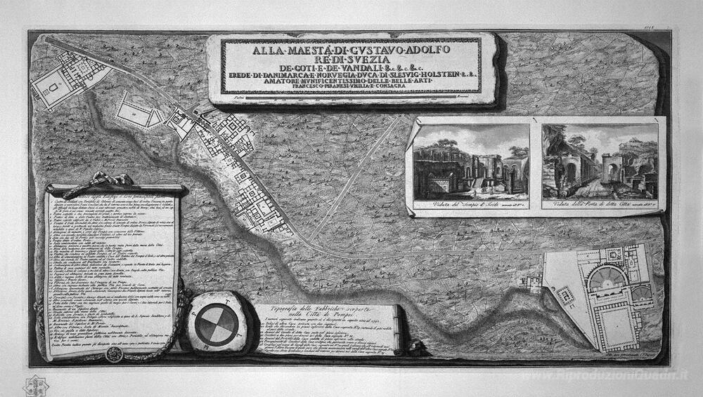 Ti offriamo una riproduzione artigianale su tela dell'opera famosa 'Topografia delle fabbriche scoperto nella città di Pompei, con u' di Giovanni Battista Piranesi, dal Museo delle Riproduzioni.