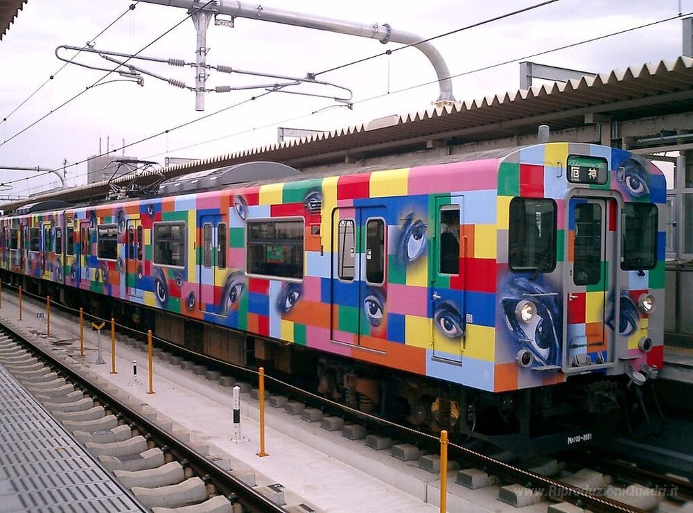 Ti offriamo una riproduzione artigianale su tela dell'opera famosa 'Treno con gli occhi' di Tadanori Yokoo, dal Museo delle Riproduzioni.