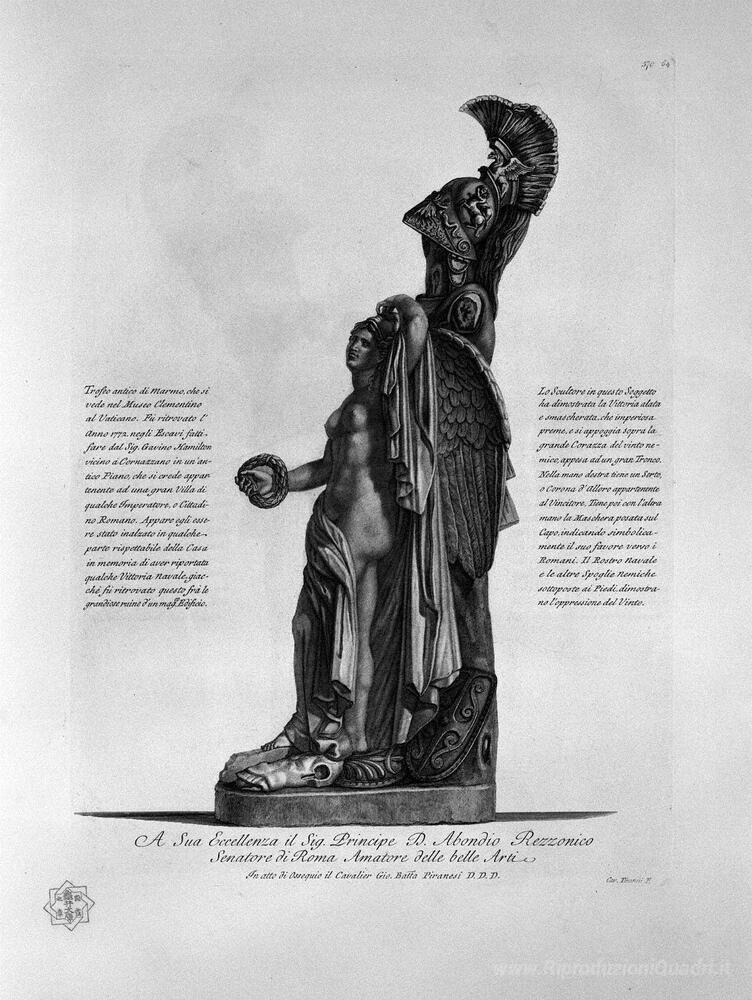 Ti offriamo una riproduzione artigianale su tela dell'opera famosa 'Trofeo dell'antica Clementino di marmo al Museo Vaticano, che è ' di Giovanni Battista Piranesi, dal Museo delle Riproduzioni.