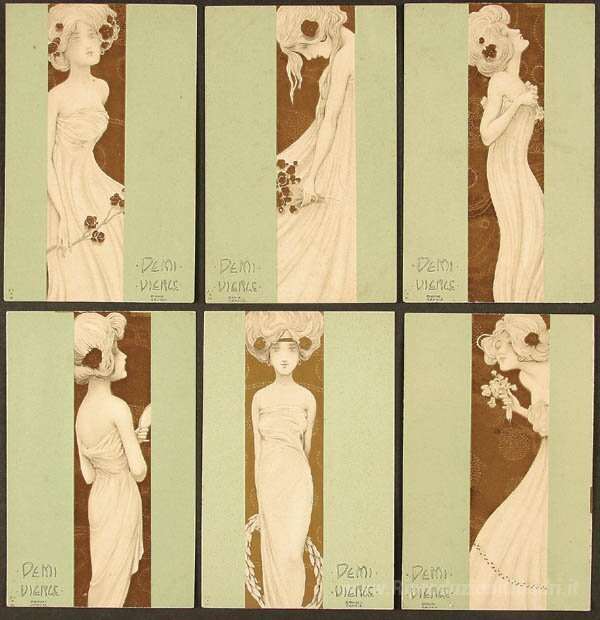 Ti offriamo una riproduzione artigianale su tela dell'opera famosa 'Un mezzo di una Vergine' di Raphael Kirchner, dal Museo delle Riproduzioni.