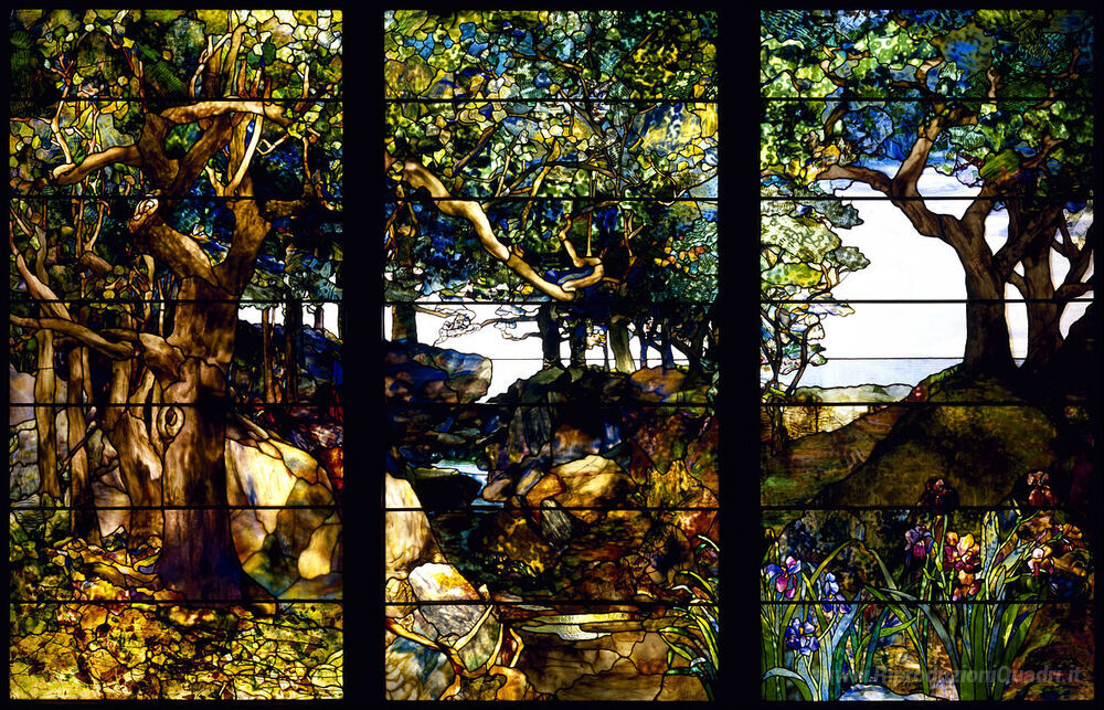 Ti offriamo una riproduzione artigianale su tela dell'opera famosa 'Un Paesaggio boschivo in tre pannelli' di Louis Comfort Tiffany, dal Museo delle Riproduzioni.