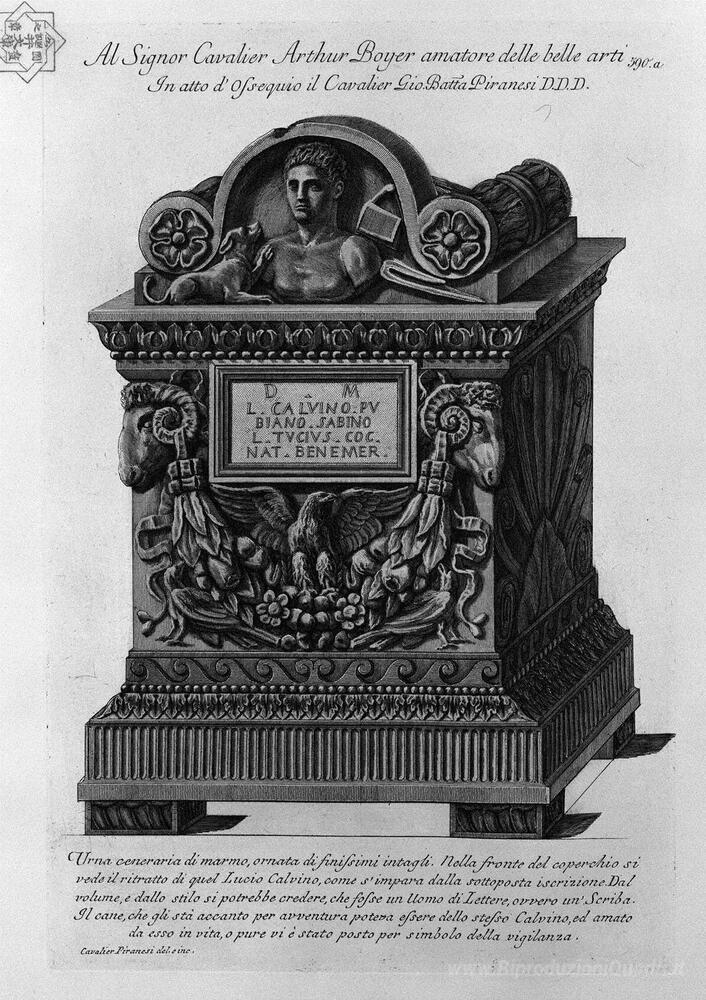 Ti offriamo una riproduzione artigianale su tela dell'opera famosa 'Urna di marmo Lucio Calvino' di Giovanni Battista Piranesi, dal Museo delle Riproduzioni.
