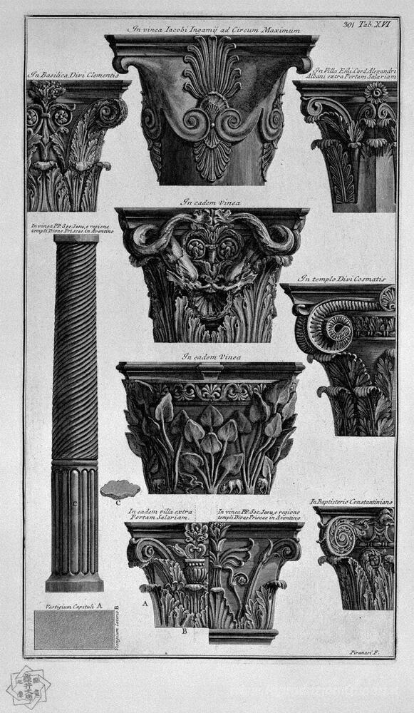 Ti offriamo una riproduzione artigianale su tela dell'opera famosa 'Varie capitali, colonna (Villa Albani, San Clemente, San Cosma, ' di Giovanni Battista Piranesi, dal Museo delle Riproduzioni.