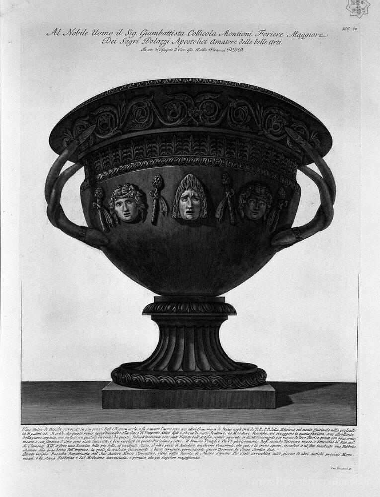 Ti offriamo una riproduzione artigianale su tela dell'opera famosa 'Vaso antico basalto trovato sul Quirinale nel 1772' di Giovanni Battista Piranesi, dal Museo delle Riproduzioni.