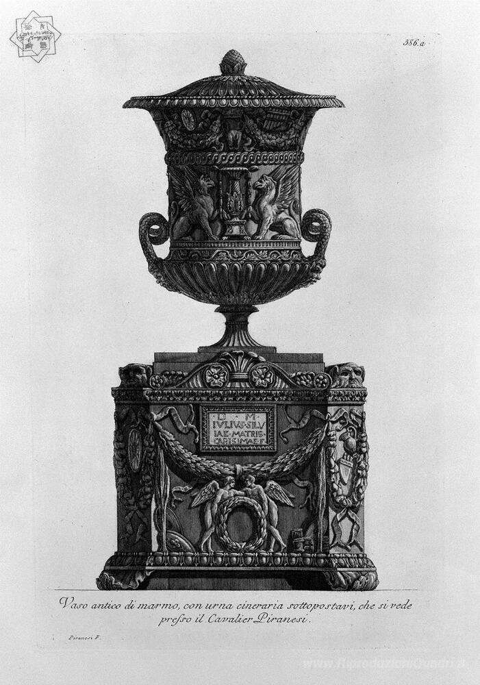 Ti offriamo una riproduzione artigianale su tela dell'opera famosa 'Vaso antico su un'urna cineraria in marmo' di Giovanni Battista Piranesi, dal Museo delle Riproduzioni.