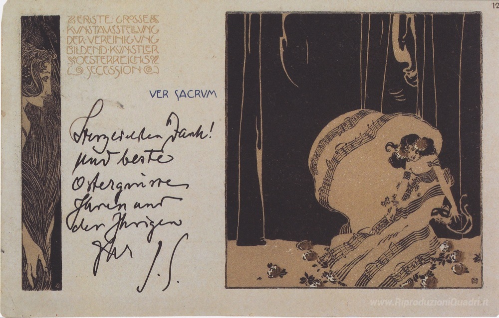 Ti offriamo una riproduzione artigianale su tela dell'opera famosa 'Ver Sacrum cartolina nr. 12 I. Secessionausstellung con la linea' di Koloman Moser, dal Museo delle Riproduzioni.