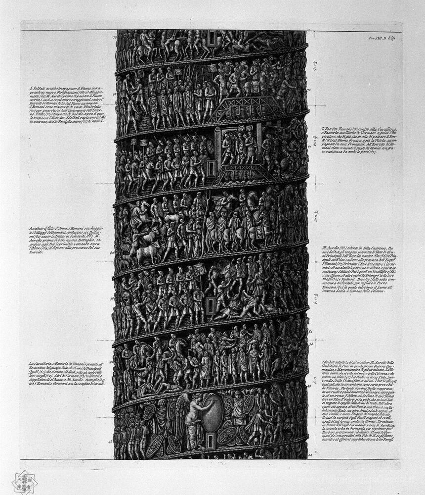 Ti offriamo una riproduzione artigianale su tela dell'opera famosa 'Vista della facciata principale della colonna Antonina, in sei t' di Giovanni Battista Piranesi, dal Museo delle Riproduzioni.