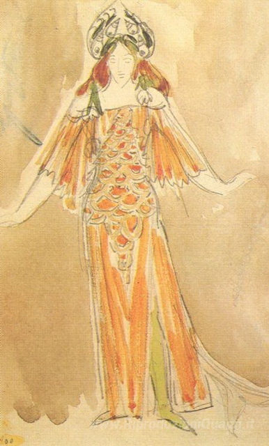 Ti offriamo una riproduzione artigianale su tela dell'opera famosa 'Volkhova, la principessa mare (disegno di costume per l'opera "S' di Mikhail Vrubel, dal Museo delle Riproduzioni.