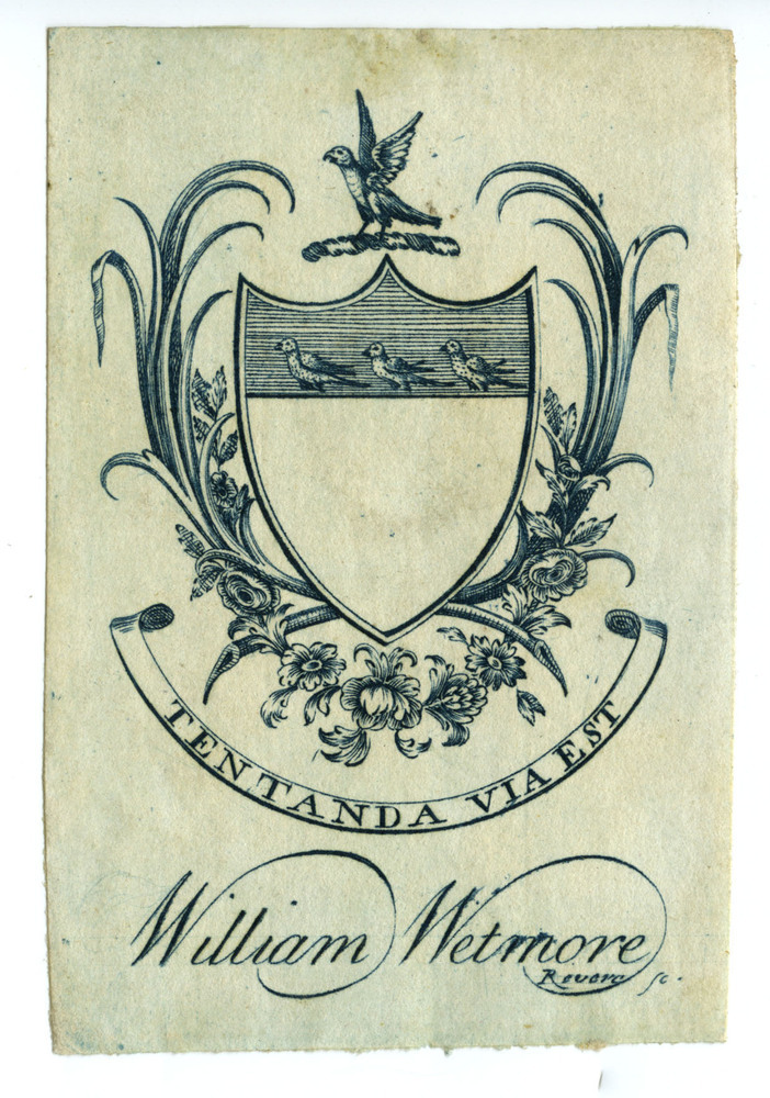 Ti offriamo una riproduzione artigianale su tela dell'opera famosa 'William Wetmore Bookplate' di Paul Revere, dal Museo delle Riproduzioni.