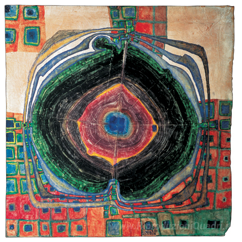 Ti offriamo una riproduzione artigianale su tela dell'opera famosa '227 una goccia di pioggia che cade nella Città' di Friedensreich Hundertwasser, dal Museo delle Riproduzioni.