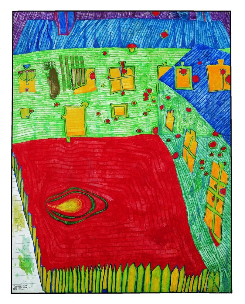 Ti offriamo una riproduzione artigianale su tela dell'opera famosa '531 Casa di Ebreo in Austria' di Friedensreich Hundertwasser, dal Museo delle Riproduzioni.