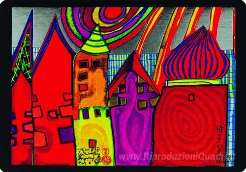Ti offriamo una riproduzione artigianale su tela dell'opera famosa '637A attesa Case' di Friedensreich Hundertwasser, dal Museo delle Riproduzioni.