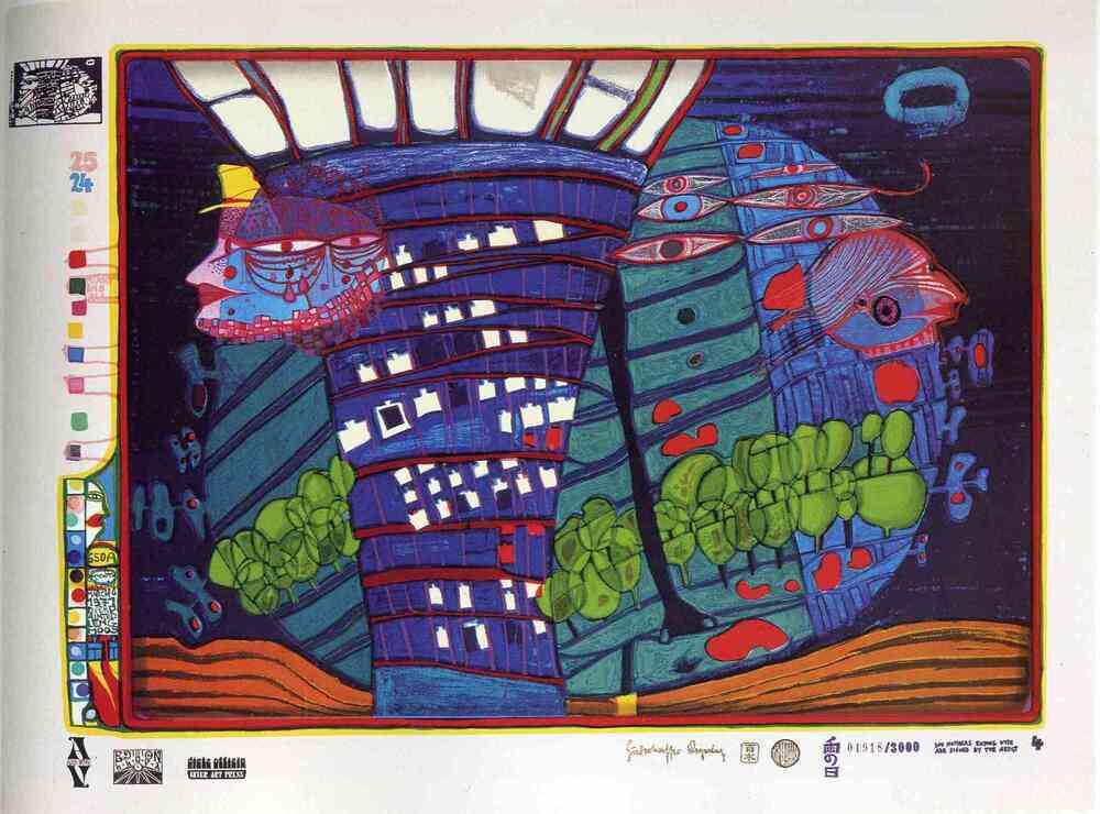 Ti offriamo una riproduzione artigianale su tela dell'opera famosa '650A Exodus Into Space' di Friedensreich Hundertwasser, dal Museo delle Riproduzioni.