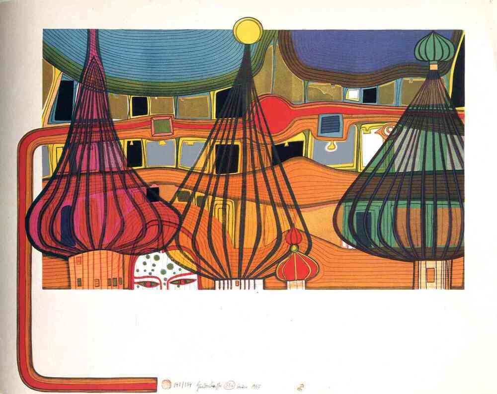 Ti offriamo una riproduzione artigianale su tela dell'opera famosa '656 La Cacciata' di Friedensreich Hundertwasser, dal Museo delle Riproduzioni.