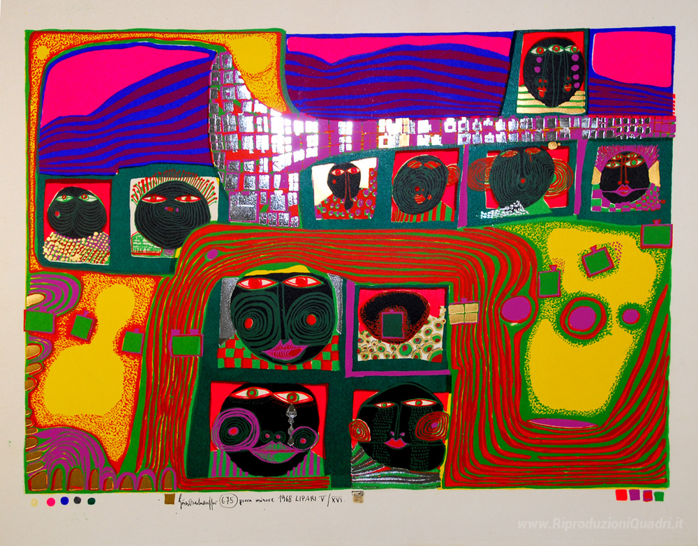 Ti offriamo una riproduzione artigianale su tela dell'opera famosa '675 Regno dei Toro' di Friedensreich Hundertwasser, dal Museo delle Riproduzioni.