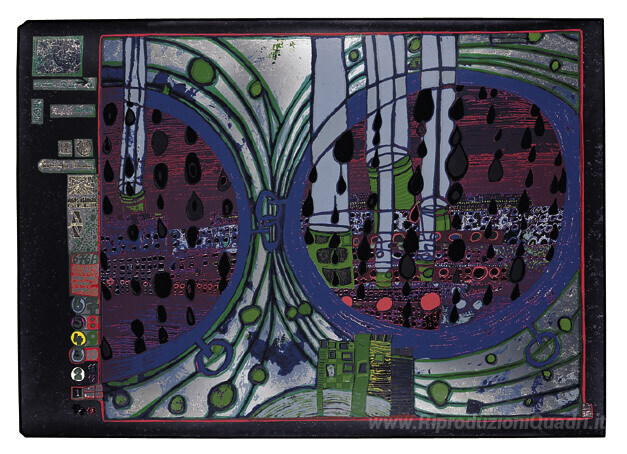 Ti offriamo una riproduzione artigianale su tela dell'opera famosa '676A i tempi duri sul Regentag' di Friedensreich Hundertwasser, dal Museo delle Riproduzioni.