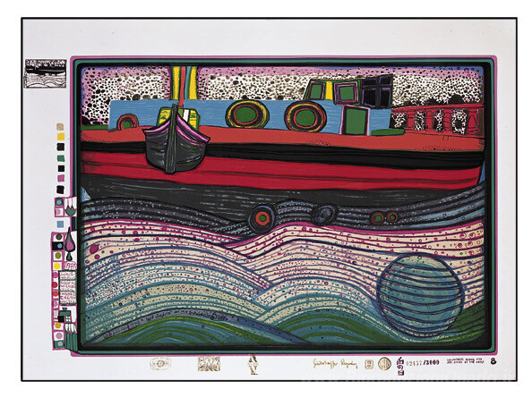 Ti offriamo una riproduzione artigianale su tela dell'opera famosa '697A Regentag sulle Onde d'Amore' di Friedensreich Hundertwasser, dal Museo delle Riproduzioni.
