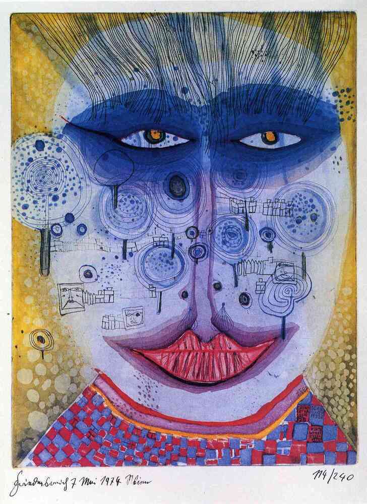 Ti offriamo una riproduzione artigianale su tela dell'opera famosa '728 Meadowman' di Friedensreich Hundertwasser, dal Museo delle Riproduzioni.