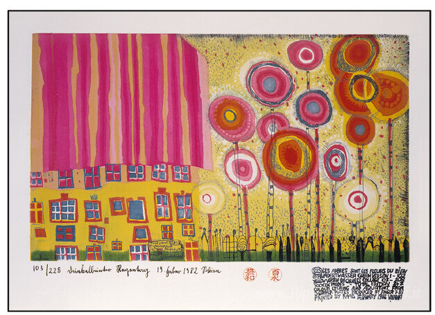 Ti offriamo una riproduzione artigianale su tela dell'opera famosa '825 Gli alberi sono i Fiori del Bene' di Friedensreich Hundertwasser, dal Museo delle Riproduzioni.