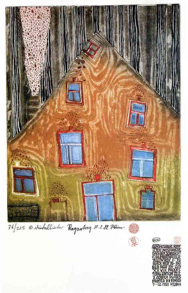 Ti offriamo una riproduzione artigianale su tela dell'opera famosa '826 Nostalgic tetto' di Friedensreich Hundertwasser, dal Museo delle Riproduzioni.