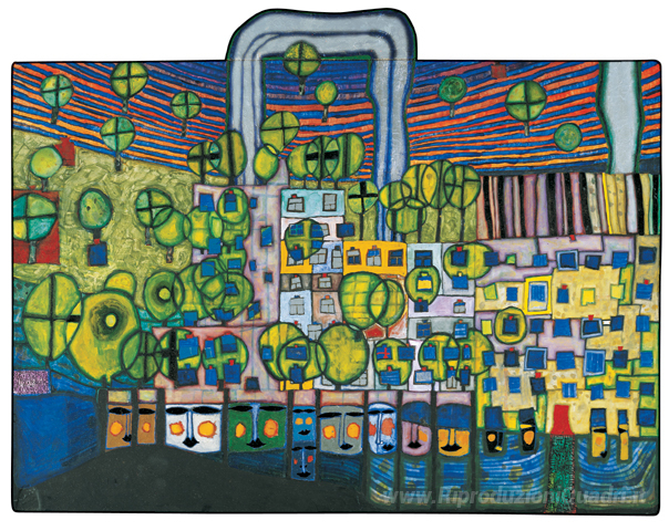 Ti offriamo una riproduzione artigianale su tela dell'opera famosa '839 Il Terzo Pelle' di Friedensreich Hundertwasser, dal Museo delle Riproduzioni.