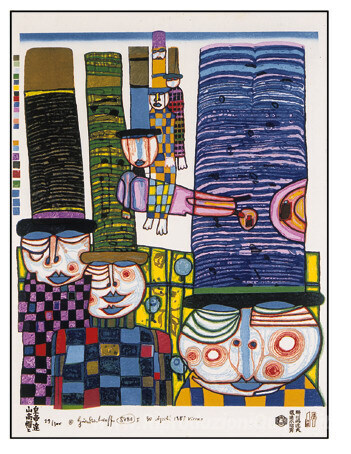 Ti offriamo una riproduzione artigianale su tela dell'opera famosa '844A Tennos Fly Con Cappelli' di Friedensreich Hundertwasser, dal Museo delle Riproduzioni.