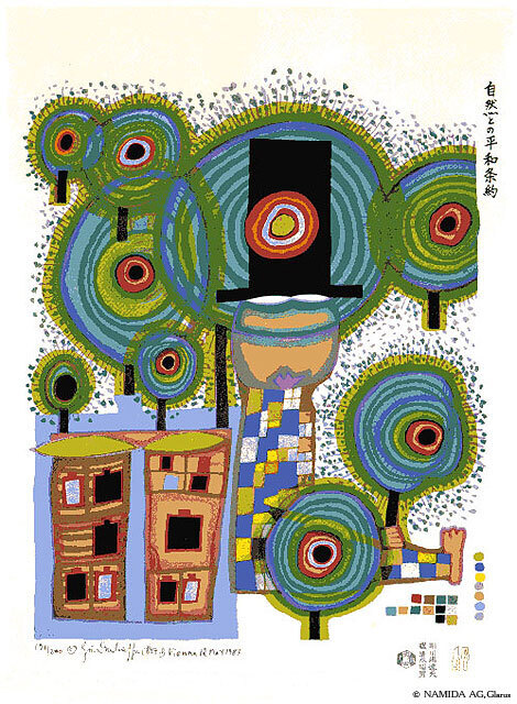 Ti offriamo una riproduzione artigianale su tela dell'opera famosa '847A Trattato di pace con la natura' di Friedensreich Hundertwasser, dal Museo delle Riproduzioni.