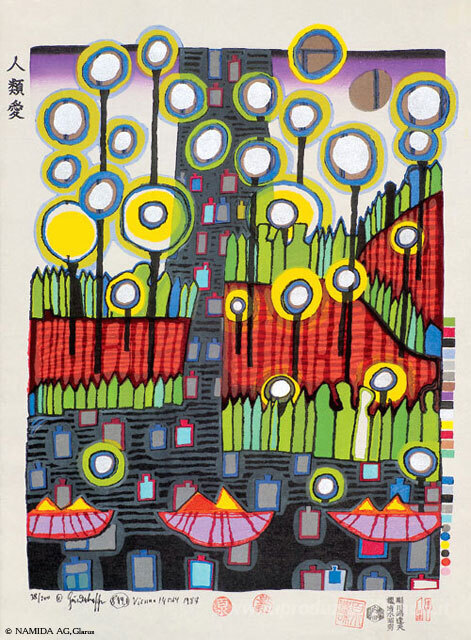 Ti offriamo una riproduzione artigianale su tela dell'opera famosa '849A Homo Humus Humanitas' di Friedensreich Hundertwasser, dal Museo delle Riproduzioni.