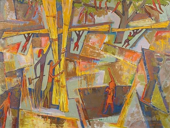 Ti offriamo una riproduzione artigianale su tela dell'opera famosa 'Africani in autunno, l'erba gialla' di Walter Battiss, dal Museo delle Riproduzioni.