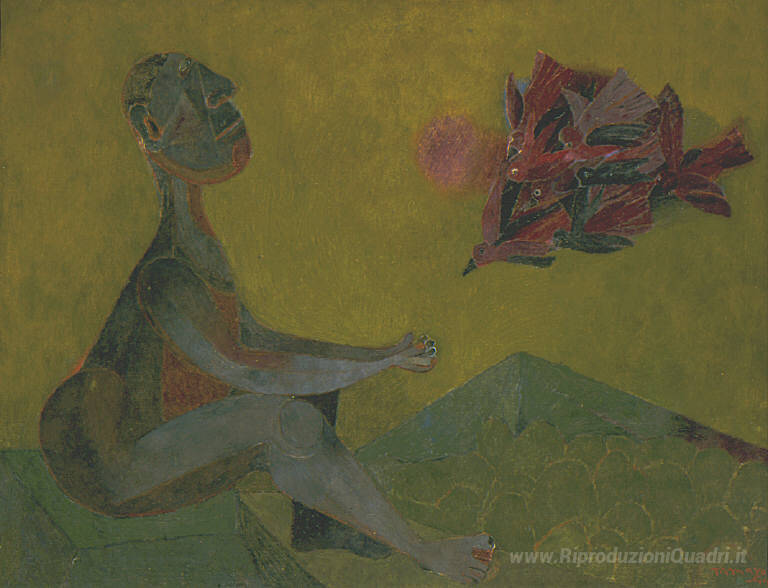 Ti offriamo una riproduzione artigianale su tela dell'opera famosa 'Amico degli Uccelli' di Rufino Tamayo, dal Museo delle Riproduzioni.