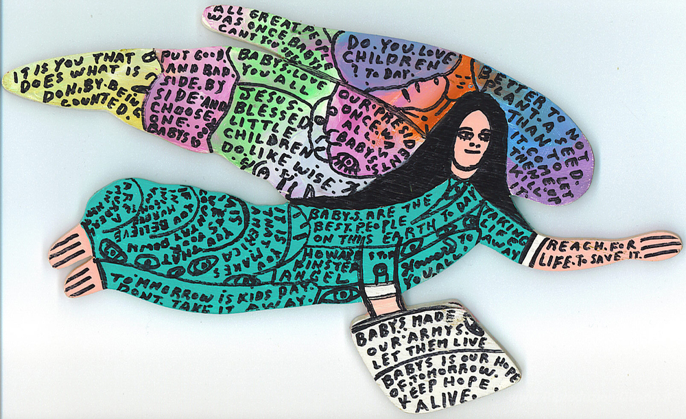 Ti offriamo una riproduzione artigianale su tela dell'opera famosa 'Angelo del bambino' di Howard Finster, dal Museo delle Riproduzioni.