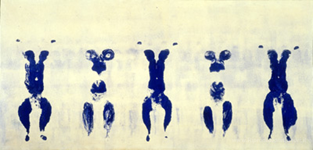 Ti offriamo una riproduzione artigianale su tela dell'opera famosa 'Antropometrie del Periodo Blu' di Yves Klein, dal Museo delle Riproduzioni.