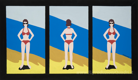Ti offriamo una riproduzione artigianale su tela dell'opera famosa 'Bikini Trittico' di Marjorie Strider, dal Museo delle Riproduzioni.