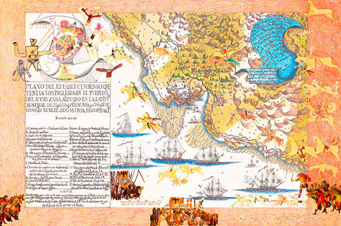 Realizzato con tecniche miste che combinano il tradizionale olio su tela, questo dipinto non solo arricchisce qualsiasi ambiente, ma invita anche a una riflessione sull'arte e la sua interazione con la storia. La vibrante rappresentazione della flotta britannica e il contesto delle Isole Falkland creano un'atmosfera unica, rendendo questo quadro un elemento essenziale per chi desidera donare carattere e personalità al proprio spazio.
