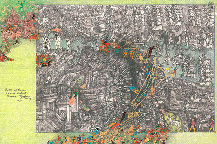 Ti offriamo una riproduzione artigianale su tela dell'opera famosa 'Boys 'Art # 8: Battaglia di Panipat' di Joyce Kozloff, dal Museo delle Riproduzioni.
