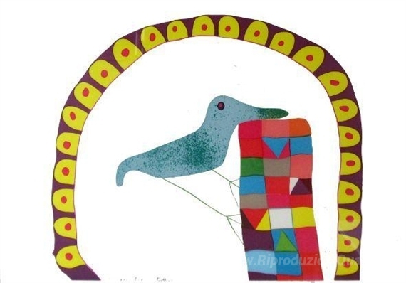 Ti offriamo una riproduzione artigianale su tela dell'opera famosa 'Carriera Uccello' di Walter Battiss, dal Museo delle Riproduzioni.