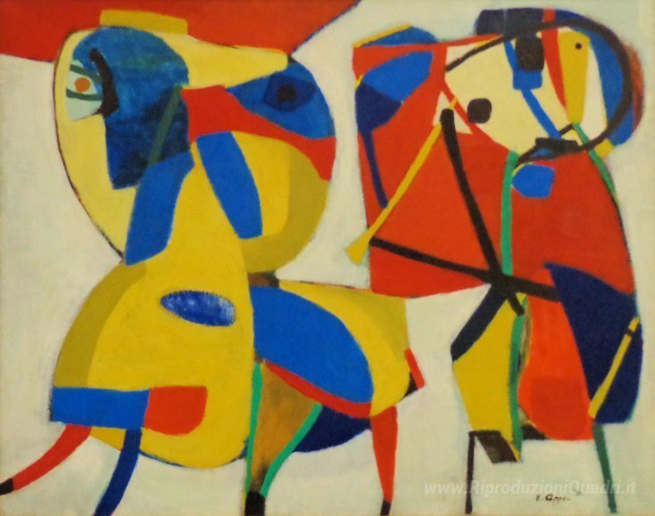 Ti offriamo una riproduzione artigianale su tela dell'opera famosa 'Cavallo e Flute Player' di Karel Appel, dal Museo delle Riproduzioni.