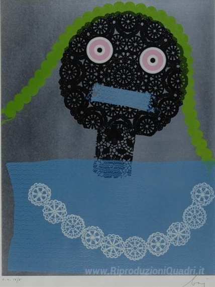 Ti offriamo una riproduzione artigianale su tela dell'opera famosa 'Centrino ragazza' di Enrico Baj, dal Museo delle Riproduzioni.