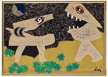 Questo dipinto, caratterizzato da colori vivaci e forme dinamiche, esprime una profonda interazione tra le figure rappresentate, evocando un senso di dialogo e connessione. La presenza di Composizione con due figure trasforma l'atmosfera di qualsiasi spazio, offrendo ai vostri ambienti un tocco di originalità e sofisticatezza. Le opere di Baj sono perfette per coloro che cercano di arricchire i propri ambienti con arte che stimola conversazione e contemplazione.