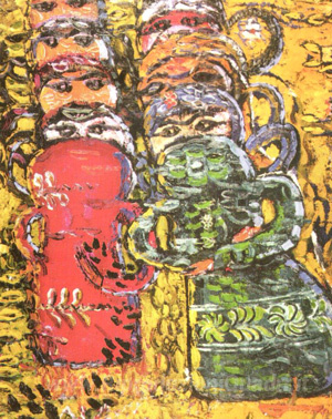 Ti offriamo una riproduzione artigianale su tela dell'opera famosa 'Composizione wtih Dolls' di Ion Tuculescu, dal Museo delle Riproduzioni.