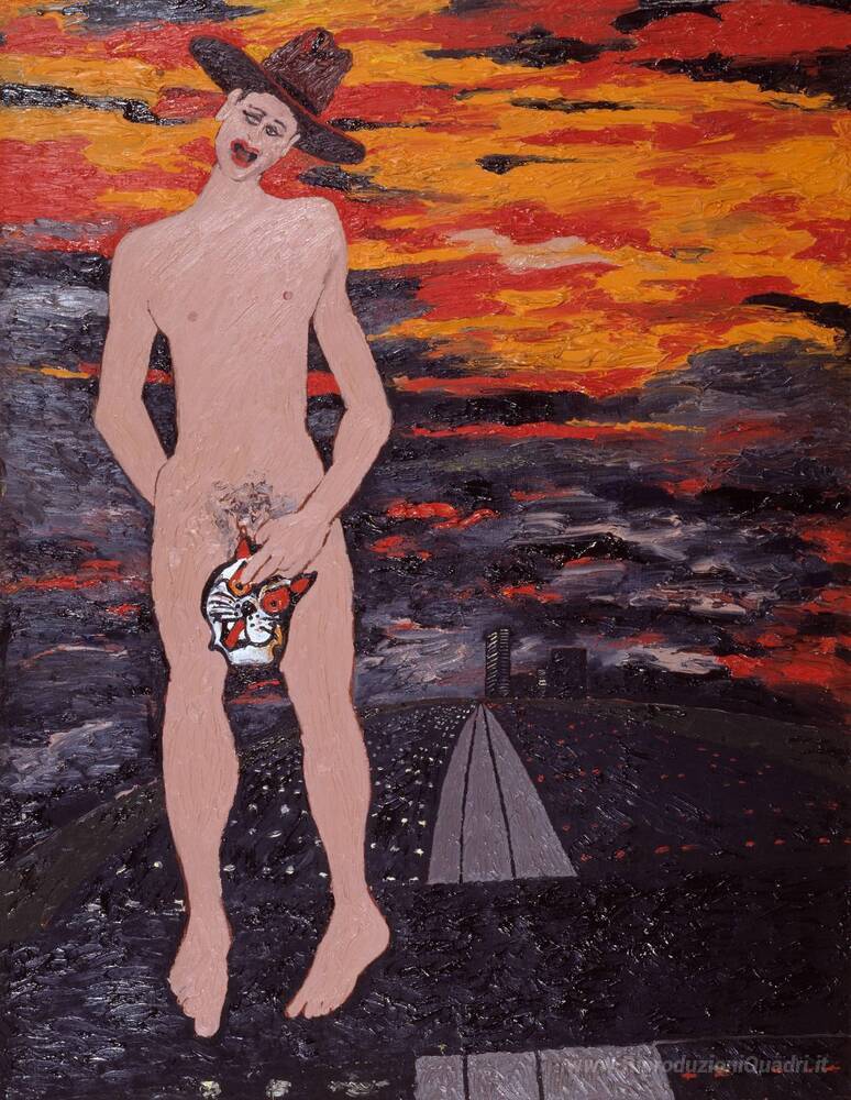Ti offriamo una riproduzione artigianale su tela dell'opera famosa 'Cowboy Shy' di Derek Boshier, dal Museo delle Riproduzioni.